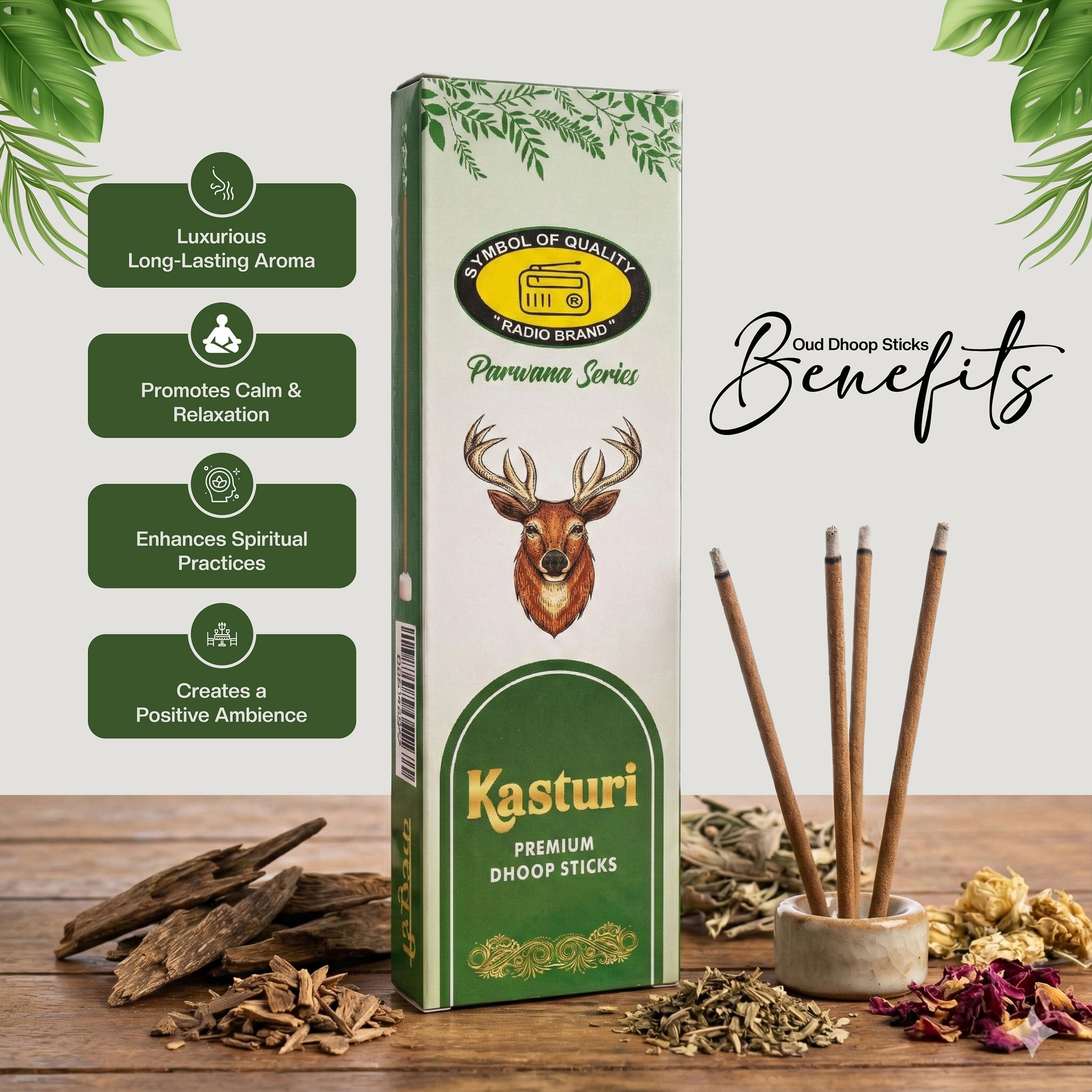 Time to experience the calming essence of nature anywhere at your comfort with Radio Dhoop Sticks. Kasturi Premium Dhoop Sticks is prepared with Kasturi to give you an aroma of rich, musky, and earthy with subtle sweet undertones of fragrance. These dhoop sticks offer a luxurious blend of warmth and serenity perfect for elevating your spiritual activity.