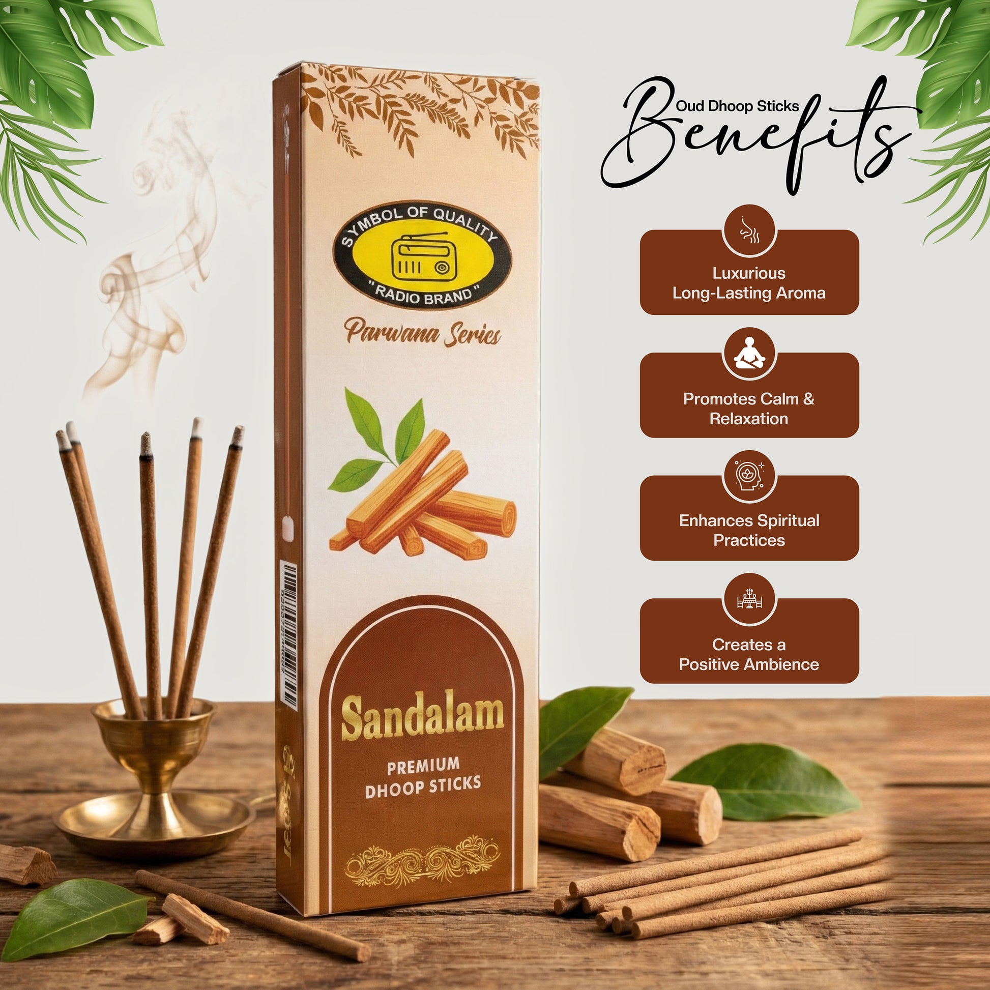 Time to experience the calming essence of nature anywhere at your comfort with Radio Dhoop Sticks. Sandalam Premium Dhoop Sticks is prepared with sandals(Chandan) to give you a sweet and woody aroma of fragrance. These dhoop sticks offer a luxurious blend of warmth and serenity perfect for elevating your spiritual activity.